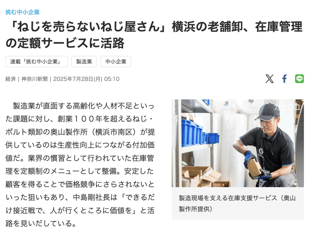 奥山製作所代表中島剛さんが在庫管理支援サービスで神奈川新聞に掲載されました